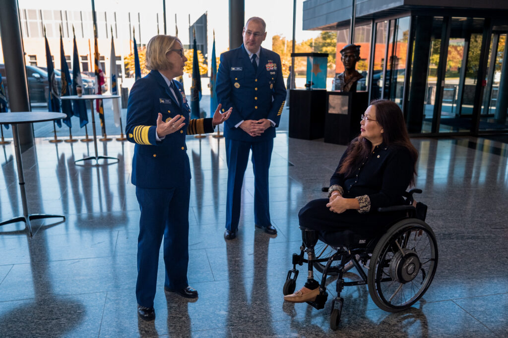 Admiral Linda Fagan and Master Chief Petty Officer of the Coast Guard Heath Jones converse Oct. 19. 2023 with Senator Tammy Duckworth in observance of National Disability Employment Awareness Month. U.S. Coast Guard | Petty Officer 2nd Class Erik Villa Rodriguez