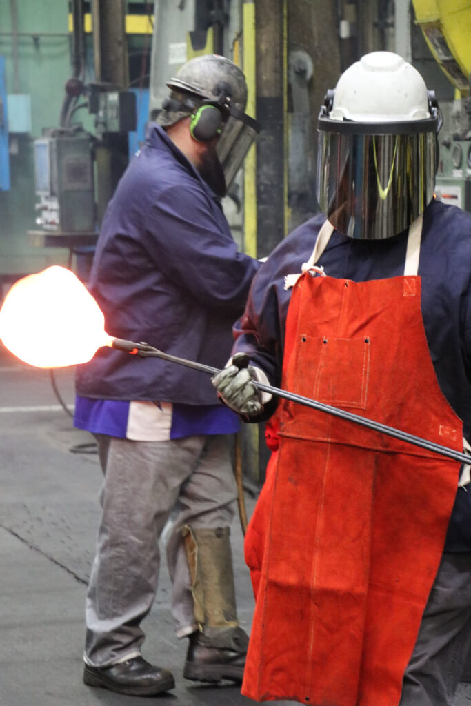 A Rock Island Arsenal-Joint Manufacturing and Technology Center artisan transfers a metal component during the forging process as part of a demonstration at the U.S. Army Tank-automotive and Armaments Command Casting & Forging Summit in 2022. The event gathered experts and officials across the government, military, industry and academia to discuss how to best modernize and sustain manufacturing operations critical to national security. U.S. ARMY U.S. Army | Hayley Smith, Rock Island Arsenal-Joint Manufacturing and Technology Center