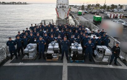 From Public Affairs Detachment Tampa Bay, Oct. 23, 2024 ST. PETERSBURG, Fla. – The crew of U.S. Coast Guard Cutter Resolute offloaded approximately 9,690 pounds of cocaine and 5,490 pounds of marijuana, worth an estimated $115 million, in their homeport of St. Petersburg, Wednesday. In addition to the contraband, Resolute’s crew previously transferred five suspected smugglers ashore to face federal prosecution by the U.S. Department of Justice. Resolute’s crew deployed to the…