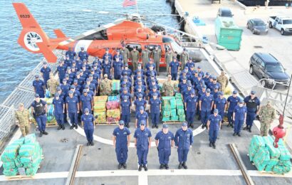 From the U.S. Coast Guard 7th District, Aug. 23, 2024 MIAMI – The crew of Coast Guard Cutter Escanaba (WMEC 907) offloaded more than 3,400 pounds of cocaine and 4,410 pounds of marijuana with a combined assessed street value of…