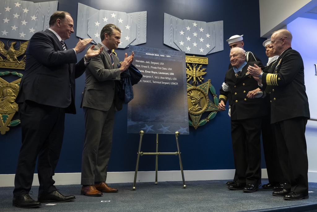 Last night President Donald J. Trump awarded retired Navy Capt. Elmer Royce Williams the Medal of Honor at the State of the Union address at the U.S. Capitol. Today, Secretary of War Pete Hegseth, Secretary of the Navy John Phelan, and Chief of Naval Operations Adm. Daryl Caudle inducted Williams into the Pentagon’s Hall of Heroes for his heroic actions during the Korean War.