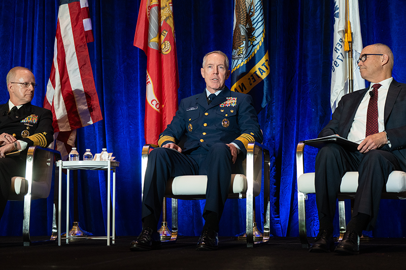 Admiral Daryl Caudle, left, Admiral Kevin Lunday and Rick Hunt share thoughts during the panel. Photo credit: Dan Goodrich