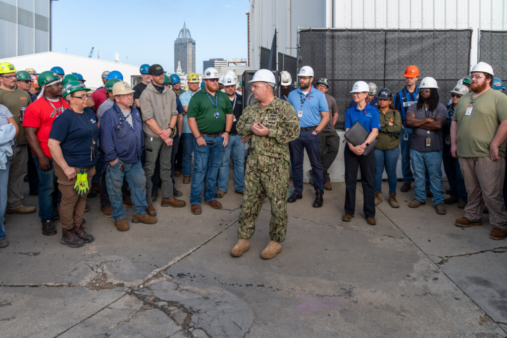 MOBILE, Ala. – Austal USA welcomed Rear Admiral (RADM) Jonathan Rucker, PEO Attack Submarines, at the company’s Mobile, Ala. shipyard yesterday. RADM Rucker began his visit by addressing more than 200 members of the Austal USA and General Dynamics Electric Boat submarine manufacturing team. RADM Rucker emphasized the valuable work they are doing for the Virginia-and Columbia-class submarine programs. He then toured Austal USA’s advanced ship manufacturing facility and discussed the company’s critical role as a strategic partner to grow the submarine industrial base.