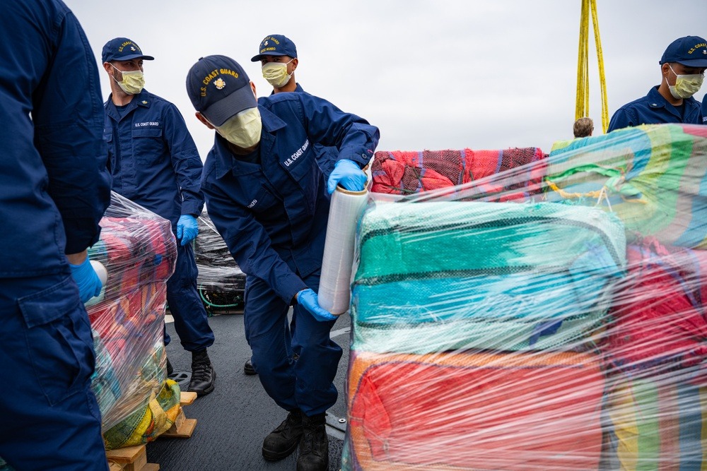 The offload is a result of eight separate suspected drug smuggling vessel interdictions or events off the coasts of Mexico and Central and South America by the Coast Guard Cutter Munro in February and March.