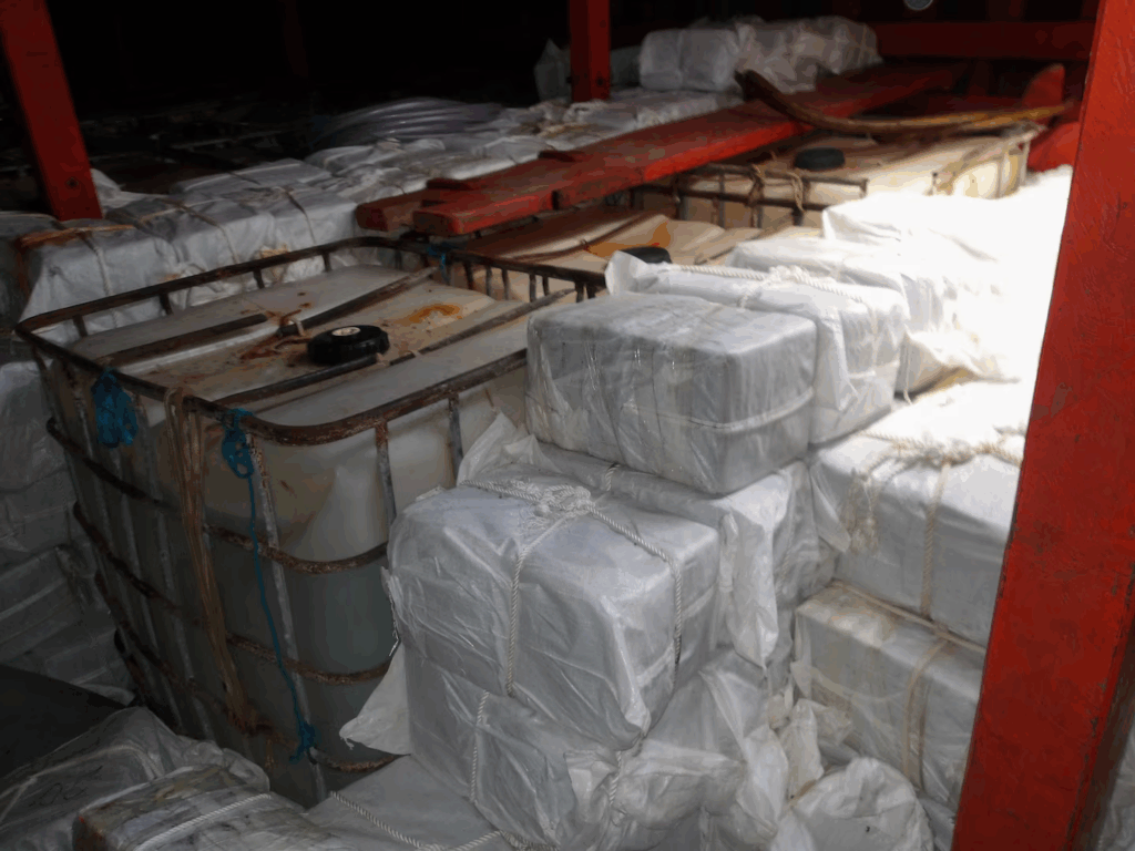 The seized contraband was the result of an interdiction in international waters in the Atlantic Ocean, and five suspected smugglers remain in U.S. custody pending prosecutorial disposition.