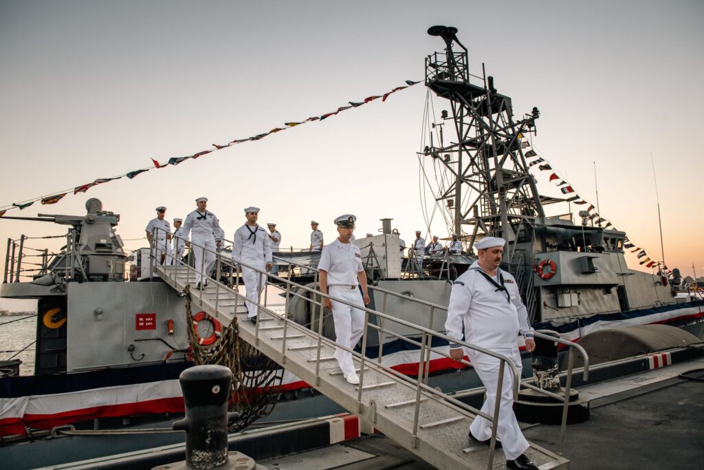 Sailors disembark patrol coastal ship USS Typhoon (PC 5) during the ship’s decommissioning ceremony at Naval Support Activity Bahrain. Typhoon commissioned in 1994 and began conducting routine coastal patrol operations under U.S. 5th Fleet in 2004. U.S. NAVY / Mass Communication Specialist 2nd Class Dawson Roth