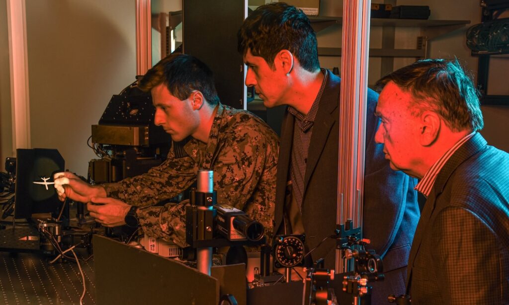 With a short-wavelength infrared (SWIR) tracking camera, the telescope can record images of a drone that is miles away. Although necessary, replicating the view of a distant drone in a small laboratory is impossible. To resolve this dilemma, researchers mounted 3D-printed, titanium miniature models of drones fabricated by AFRL into a range-in-a-box (RIAB).