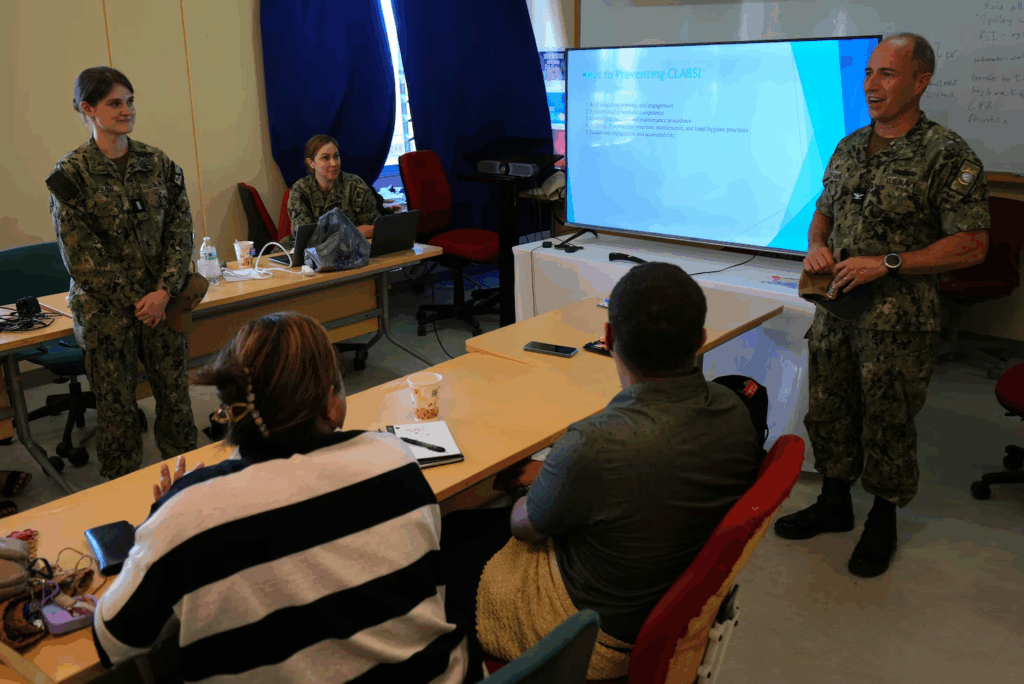 NUKU’ALOFA, Tonga (June 18, 2025) Capt. Mark B. Stefanik, right, mission commander of Pacific Partnership 2025 (PP-25), provides remarks during a nursing workshop at Vaiola Hospital as part of PP-25 in Nuku’Alofa, Tonga, June 18, 2025. (U.S. Navy photo by MC2 Moises Sandoval/Released)