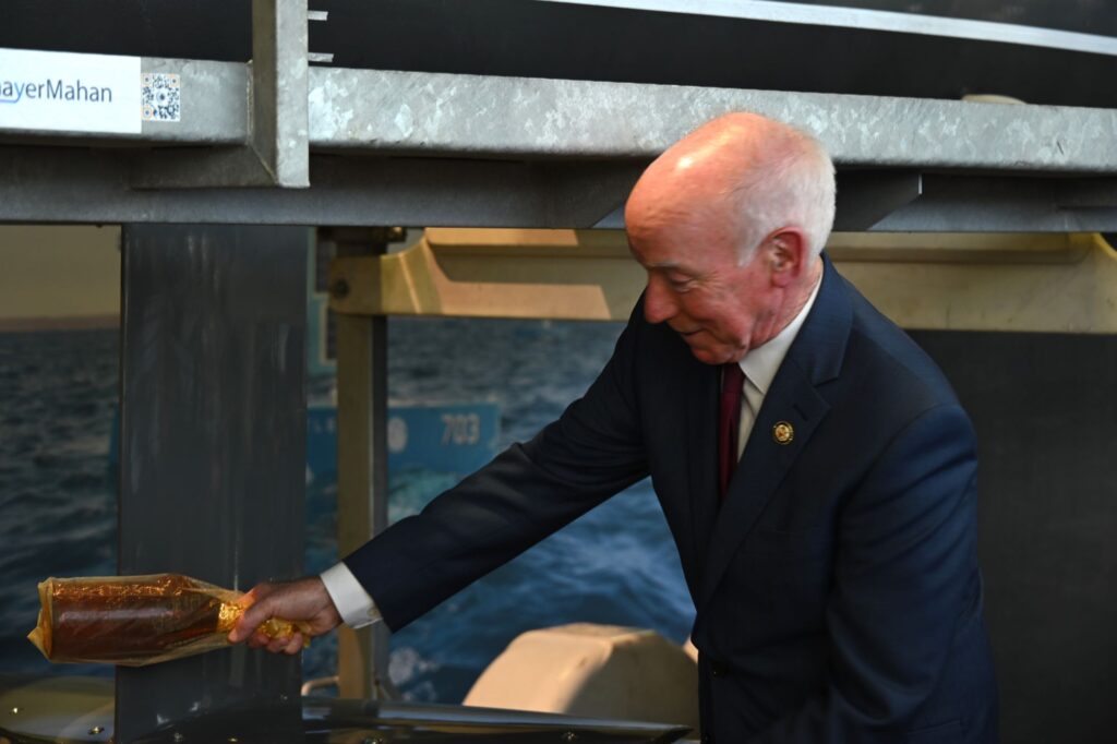 Courtney broke a bottle of “champagne” against the hull of an unmanned surface vessel, the Bluebottle USV from Australia’s Ocius Technology Ltd. The vehicle is equipped with a towed sensor array and related technology from Connecticut-based ThayerMahan (Booth 2039).