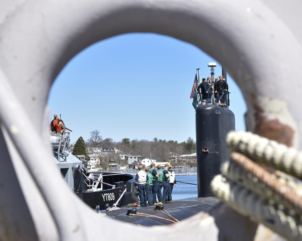USS Greeneville (SSN 772) departs Portsmouth Naval Shipyard in Kittery, Maine, in April 2024. Greeneville had been at the shipyard for a scheduled maintenance period since June 2021. Photo credit: U.S. Navy | Mass Communication Specialist 1st Class Charlotte Oliver