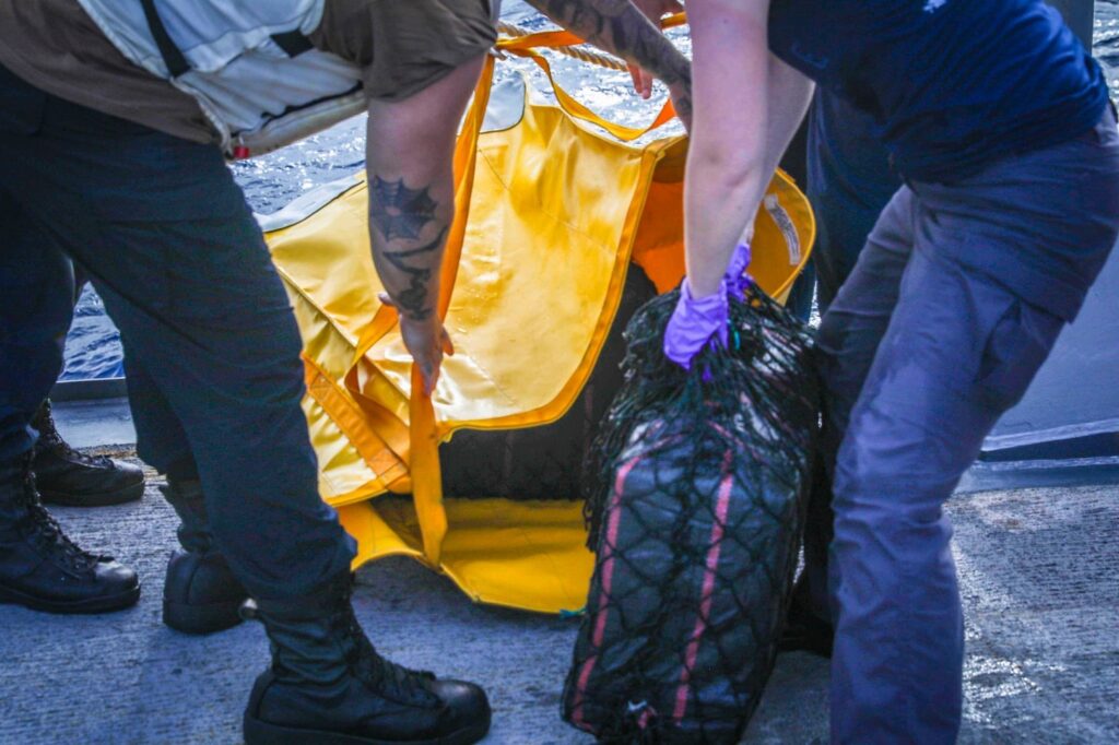 The Sampson launched two boarding teams, which recovered several of the jettisoned packages and took positive control of the suspect vessel. Coast Guard law enforcement personnel conducted a boarding and determined the vessel to be without nationality, granting authority for a full law enforcement boarding.
