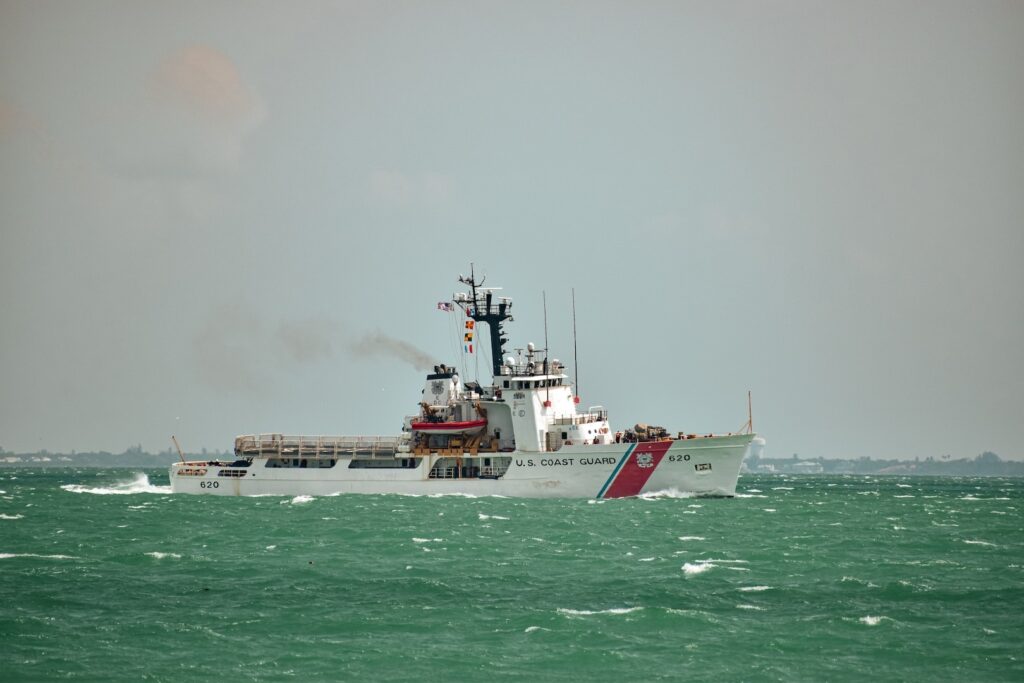 U.S. Coast Guard Cutter Resolute (WMEC 620) transits outbound for sea from homeport, St. Petersburg, Florida, ahead of a migrant interdiction and maritime safety and security patrol in the Caribbean Sea, April 10, 2024. Resolute routinely performs deterrence of illegal maritime migration throughout the Windward Passage, prioritizing the safety of life at sea and protecting the Nation’s southern maritime border. (U.S. Coast Guard photo courtesy of Coast Guard Cutter Resolute)