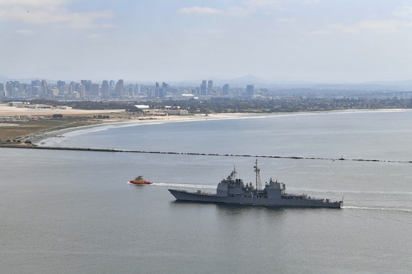 SAN DIEGO – The Ticonderoga-class guided-missile cruiser USS Cape St. George (CG 71) arrived Apr. 22 in its new homeport of Naval Base San Diego, California from Naval Base Everett, Washington, after conducting phased modernization at Vigor Shipyard in Seattle. This move was a permanent change of station for the crew and family members.