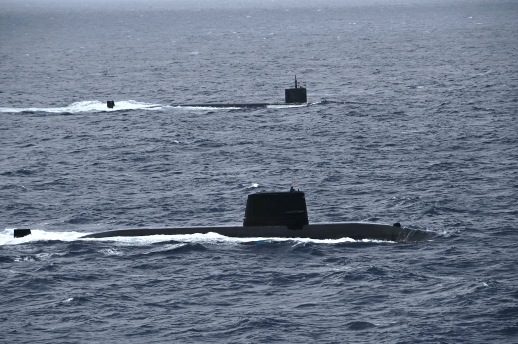 PACIFIC OCEAN (July 12, 2025) – The Los Angeles-class fast-attack submarine USS Santa Fe (SSN 763) and a Japan Maritime Self-Defense Force (JMSDF) submarine steam alongside one another during Submarine Exercise (SUBEX) 25-1, in the Pacific Ocean, July 12, 2025. (Photo courtesy of JMSDF.)