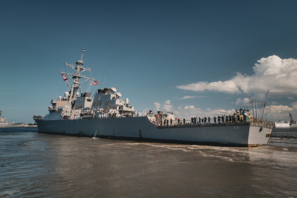 Earlier this year, The Sullivans returned from the Eastern Atlantic and Mediterranean Sea. The ship provided Ballistic Missile Defense (BMD) for Commander, U.S. European Command amidst the Israel-Hamas conflict. The Sullivans, alongside USS Delbert D. Black (DDG 119), additionally provided on-station relief for USS Thomas Hudner (DDG 116) and USS Mcfaul (DDG 74), allowing both ships to return home after multiple deployment extensions. The crew provided escort to the USS Gerald R. Ford Carrier Strike Group and USS Bataan Amphibious Readiness Group, and acted as Surface Action Group Commander, along with other U.S. Destroyers, while Gerald R. Ford conducted a port visit to Souda Bay, Crete.